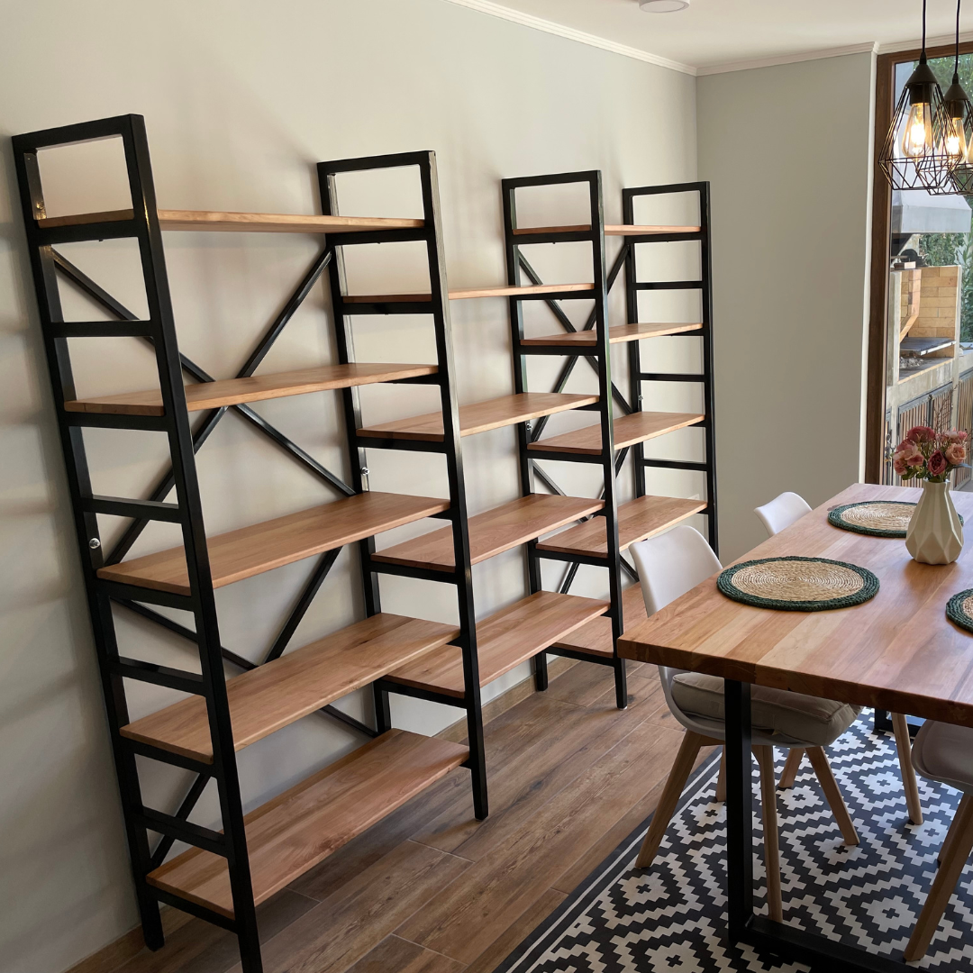 Cubierta de Lenga de 2 cm de espesor y primera selección, con protección en aceite cera, resistente a la suciedad y al desgaste, repelente al agua, dejando una superficie suave y agradable al tacto. Terminación Natural Satinada. Estructura de Metal de 20x20x2mm con electro pintura Negra o Blanca